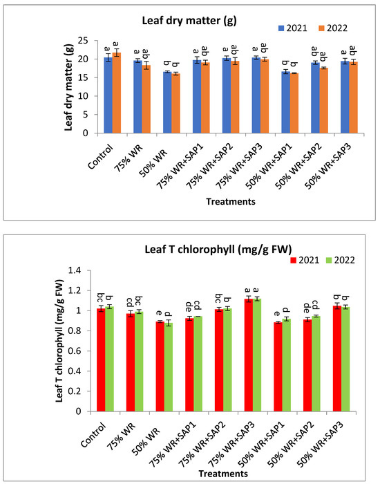 Effect of the combinations of rates of water requirement (WR) and amounts of super-absorbent polymer (SAP) on leaf dry matter (g), and total chlorophyll and proline contents (mg/g fresh weight) in green bean plants during 2021 and 2022 seasons. Different letters indicate significant differences between values at p ≤ 0.05 according to Duncan’s multiple range test. Bar represents the standard deviation.