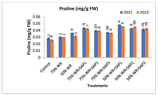 The results of the current investigation demonstrated that plants subjected to irrigation water rates of 50% WR had leaf proline contents that were significantly greater than those of the irrigation treatments at 75% WR and the control. Under drought conditions, the accumulation may be caused by increased proline biosynthesis enzyme activity or decreased proline degradation enzyme activity [78,79]. Here, the scientific evidence shows that proline accumulation is one of the crucial factors in maintaining the osmotic balance of the cell cytoplasm and preventing oxidative damage to the plant [78,80,81,82]. The findings also demonstrated that applying SAP at a rate of 3 g/plant reduced proline buildup in plant leaves at 75% WR. It was shown that SAP might be able to shield green bean plants from the effects of water stress and prevent them from suffering serious consequences [83]. These results indicated that application of SAP mitigates stress and creates suitable conditions for plant growth.