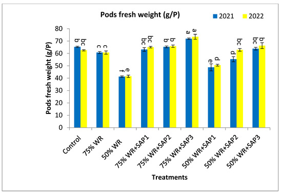 Effect of the combinations of rates of water requirement (WR) and amounts of super-absorbent polymer (SAP) on pod number and pod fresh weight per plant (g/Plant) in green bean plants during 2021 and 2022 seasons. Different letters indicate significant differences between values at p ≤ 0.05 according to Duncan’s multiple range test. Bar represents the standard deviation.
