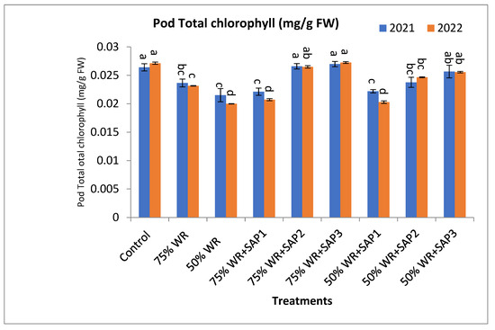 The data concerning pod total chlorophyll and carotenoid contents indicated that these contents were significantly decreased by water shortages of 75% and 50% WR compared with the control at 100% WR (Figure 4). By comparison, interference between WR rates and SAP amounts showed that the largest contents of chlorophyll a, b, and total chlorophyll of pods were found by adding 3 g/plant of SAP in the presence of 75% WR, while the least significant result was observed from using SAP at 1 g/plant and the irrigation rate of 50% WR (Figure 4).