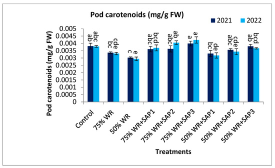Effect of the combinations of rates of water requirement (WR) and amounts of super-absorbent polymer (SAP) on pod total chlorophyll (mg/g fresh weight) and carotenoid contents (mg/g fresh weight) in green bean plants during 2021 and 2022 seasons. Different letters indicate significant differences between values at p ≤ 0.05 according to Duncan’s multiple range test. Bar represents the standard deviation.