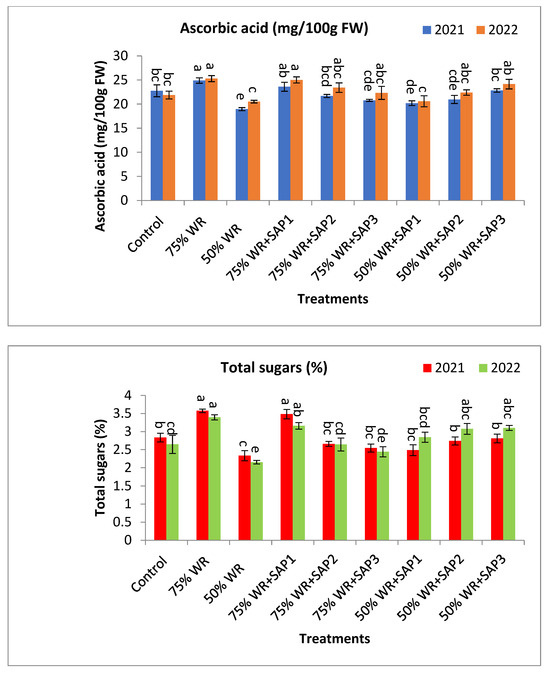 Effect of the combinations of rates of water requirement (WR) and amounts of super-absorbent polymer (SAP) on ascorbic acid (mg/100 g fresh weight), and total contents of sugars and total soluble solids in green bean plants during 2021 and 2022 seasons. Different letters indicate significant differences between values at p ≤ 0.05 according to Duncan’s multiple range test. Bar represents the standard deviation.