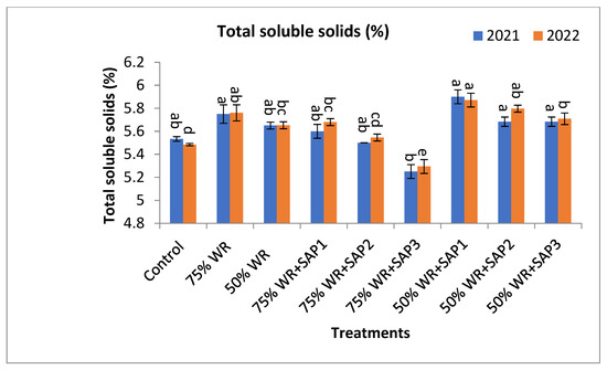 It is noteworthy that the highest value in TSS content was observed with the SAP application at 1 g/plant with the low water irrigation treatment of 50% WR. This was attributed to enhanced metabolic activities, which resulted in the synthesis of large amounts of acids, metabolites, and glucose. These created reserves helped the original formation of TSS.