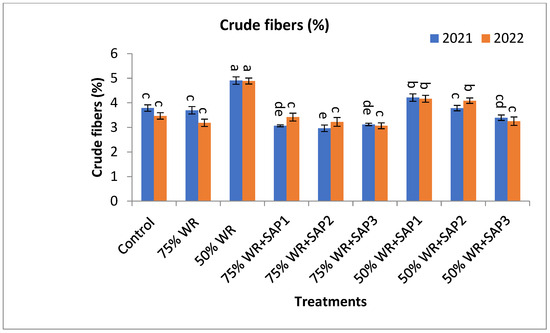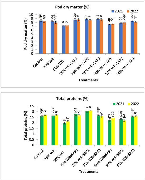 Effect of the combinations of rates of water requirement (WR) and amounts of super-absorbent polymer (SAP) on pod dry matter proteins and crude fibers in green bean plants during 2021 and 2022 seasons. Different letters indicate significant differences between values at p ≤ 0.05 according to Duncan’s multiple range test. Bar represents the standard deviation.