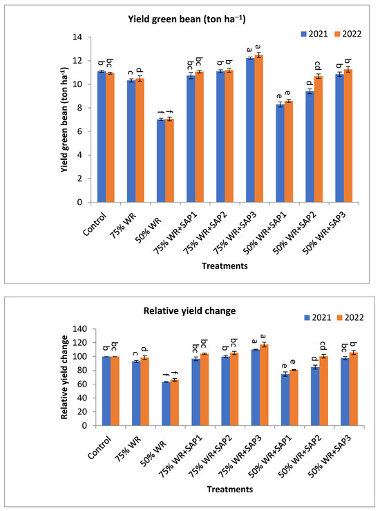 Effect of the combinations of rates of water requirements (WR) and amounts of super-absorbent polymer (SAP) on yield green bean and the relative yield change in green bean plants during 2021 and 2022 seasons. Different letters indicate significant differences between values at p ≤ 0.05 according to Duncan’s multiple range test. Bar represents the standard deviation.