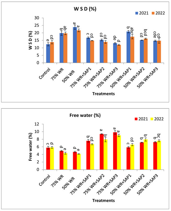 The results show that the lowest value of free water content was observed under irrigation rates of 75% WR and 50% WR. SAP applications significantly affected free water under water deficit conditions of 75% WR and 50% WR, as there was an increase in free water content with an increasing amount of SAP. Adding an amount of SAP at rates of 2 and 3 g/plant at 75% WR resulted in obtaining the highest values of free water, while the lowest values resulted under irrigation rates of 75% and 50% WR without adding SAP; Figure 8.