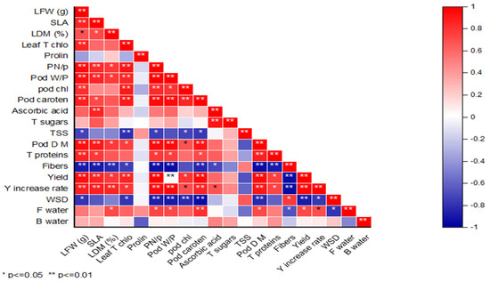 The Pearson’s correlation analysis showed significant correlations (positive or negative) between different attributes of green bean under the treatments of water stress and SAP (Figure 9). Analysis was conducted on the average data from the two studied seasons. A positive association of the measured parameters is shown with a red circle, and a negative correlation with a blue circle, in Figure 9. A positive correlation (p < 0.05 and 0.01) was observed between yield (ton/ha) with growth parameters i.e., leaf fresh weight, specific leaf area, leaf total chlorophyll, and pod number per plant. Moreover, the green bean yield was positively correlated with quality parameters, including pod total chlorophyll, pod carotenoids, pod dry matter, and total proteins. A positive correlation existed between total proteins and leaf fresh weight and pod dry matter (p < 0.01); a positive correlation (p < 0.05) was also obtained between specific leaf area and pod number per plant, pod fresh weight, and pod carotenoids. On the other hand, crude fiber content in green bean was correlated negatively with yield, pod dry matter, total proteins (p < 0.01), leaf total chlorophyll, ascorbic acid, and total sugars (p < 0.05).