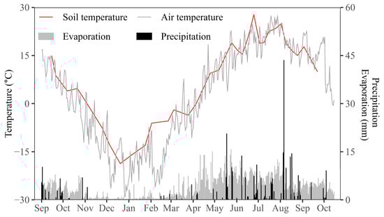 The daily mean air temperature (gray line), soil temperature at 5 cm (red line), precipitation (black bar) and evaporation (gray bar) during the study period (15 September 2018 to 15 September 2019).