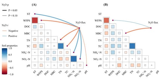 Pearson correlations among ST (soil temperature at 5 cm depth), WFPS (water-filled pore space), DOC (dissolved organic carbon), MBC (microbial biomass carbon), TN (total nitrogen content), TC (total carbon content), NH4+-N, NO3−-N and pH at 0–10 cm, and their regression with N2O flux in the growing (A) and non-growing season (B). The lower triangle shows the Pearson correlations, where the darker and lager square represents a greater correlation between two soil properties. The curve line shows the relation between N2O flux and soil properties, where the color represents the trend of regression, and the linewidth represents the significance of regression.