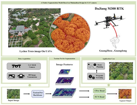 Technical roadmap and workflow. In the lychee orchard in Guangzhou, Guangdong Province, DJI M300 RTK took off to collect RGB images of lychee and other fruit trees from different angles. By downloading data such as relative altitude and focal length from DJI M300 RTK, it was determined that the real-world size corresponding to a single pixel in all images ranges from 1.24 m to 2.49 m. The trained model can effectively and accurately segment the fruit trees in the field of view, laying a visual algorithm foundation for mapping geodetic coordinates and other agricultural activities in the future. The figure shows the basic structure of the backbone network and the output segmentation heads, further serving various application scenarios, such as waypoint planning.