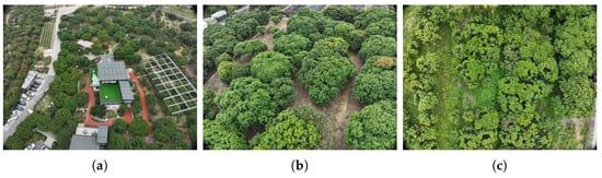 The application of agricultural drones is witnessing rapid advancements; however, the progression of visual algorithms has veered towards a direction that contradicts practical applications. In recent years, state-of-the-art backbone networks have hinged on computationally intensive feature extraction to achieve enhanced accuracy. This paper introduces Taoism-Net, which benchmarks its model using images of lychee tree canopies captured by agricultural drones. The relative working heights, with reference to the takeoff point, range from 24.9 m to 50.0 m, averaging at 32.8 m. The dataset, sourced from the RGB channels of drone-mounted sensors (depicted in Figure 2), boasts a resolution of 5280 × 3956 pixels. The data were gathered at the Guangzhou Lychee Cultural Museum, spanning several acres and encompassing photographs of lychee canopies exhibiting diverse characteristics across different periods, with the collection period spanning from February to May, covering the stages from bud initiation to fruit maturity.In recognition of the variances in real-world scenarios and to assess the model’s generalization capability, multiple lychee orchards were photographed. Considering image edge distortions, multi-angle captures were executed to accumulate a more comprehensive dataset. Relative to other prevalent segmentation models, our proposed method demonstrates structural superiority in mapping the representational space, ensuring effectiveness across datasets of similar canopy structures from different crops. Figure 2 presents exemplar images from the dataset, illustrating shooting angles varying approximately from 30° (Figure 2a) to around 60° (Figure 2b) and up to about 90° (Figure 2c). Furthermore, visual pixel points are mapped to geographical coordinates, enabling the precise localization of lychee tree canopies. This foundational visual algorithmic approach paves the way for downstream agricultural tasks, furnishing them with accurate spatial information.