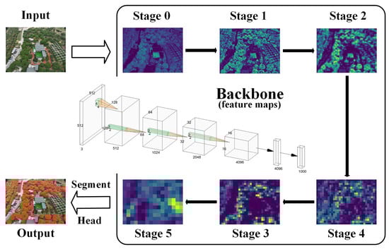 The working principle of backbone networks: taking six layers as an example, they extract local and global features layer by layer, fit nonlinear features through concurrent activation functions, and finally output segmentation results through UPerHead [18] and FCNHead [10].
