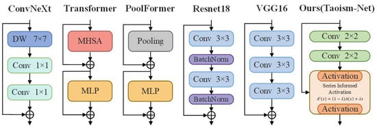 The fundamental design of neural networks has reached some consensus, with input images transformed from 3 channels to multiple channels and downsampled, and fully connected layers used for classification output. After each stage, the channels of features expand while the height and width decrease, and different networks utilize and stack different types of blocks to build deep models. Despite the success of existing deep networks, their works employ abundant complex layers to extract high-level features from the receptive field. For example, the convolutional layers of the classical AlexNet [16] use 96 convolutional kernels to operate on input images, with a kernel size of 11 × 11, while reducing the number of feature maps to avoid the risk of overfitting. The base version of VGG [17], VGG11, has 8 convolutional layers and 3 fully connected layers, with 5 pooling layers following each convolutional layer, making the architecture very complex. VGG19 has 16 convolutional layers, making the network even more complex.