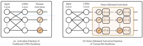 When n = 0, it is obvious that the series based activation function degenerates into a regular activation function, which can be seen as a general extension of existing activation functions. We use the ReLU variant as the basic activation function to construct the series, as its inference in GPU is efficient. The related computational cost can be expressed as Equations (4)–(6), and the computational cost of the above methods is much lower than most CNNs.