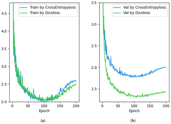 Comparison with DiceLoss and CrossEntropyLoss during Training and Validation. (a) Train loss; (b) Val loss.