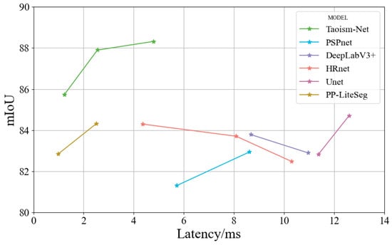 As shown in Table 2, whether compared to mainstream lightweight image segmentation models such as U-Net [25], PP-LiteSeg [26], or mature image segmentation algorithms such as DeepLabv3+ [27] and PSPNET [28], Taoism-Net has achieved significant improvement. For the dataset of this experiment, it achieved an improvement of at least 3.6% in mIoU value and won both in accuracy and speed. The method proposed in this paper benefits from the efficient backbone of Taoism, emphasizing the elegance and simplicity of design while maintaining excellent performance in computer vision tasks. Taoism-Net improves recognition accuracy by avoiding excessive depth, residuals, and complex operations such as self attention. Based on a series of simplified networks, it solves inherently complex problems and is very suitable for environments with limited resources during inference operations on UAVs. As shown in Figure 7, Taoism-Net achieves a significant improvement in accuracy speed curve testing compared to mainstream segmentation models.