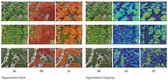 Taoism-Net and YOLOv8s-Seg perform segmentation mask and heatmaps on images captured from different perspectives. The images captured by drones with viewing angles of 30°, 60°, and 90° are selected as example images. This article uses perspective images to make the three example images more representative. Among them, (a–c) show the comparison of segmentation performance between the two models. From the figure, it can be seen that YOLOv8s Seg has problems of oversegmentation, undersegmentation, and repeated segmentation for different perspectives, flight heights, and complex road conditions. However, in the case of grass and trees alternating, it is easy to misjudge the grass as the fruit tree canopy. Taoism-Net can maintain stable and accurate segmentation results in the face of various angles, constantly changing flight altitudes, and complex road conditions. (a) Original image; (b) YOLOv8s-Seg; (c) Taoism-Net (Ours); (d) original image; (e) YOLOv8s-Seg; (f) Taoism-Net (Ours).