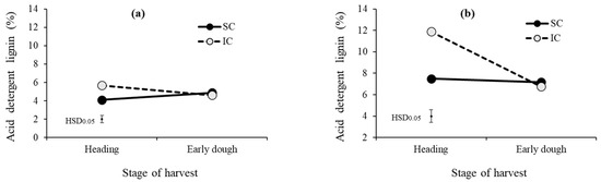 Furthermore, acid-detergent lignin (ADL) was varied by the SH × CS interaction (Figure 1a); from the first to the second stage, the values either increased (SC barley) or decreased (IC barley) by approximately 20%.
