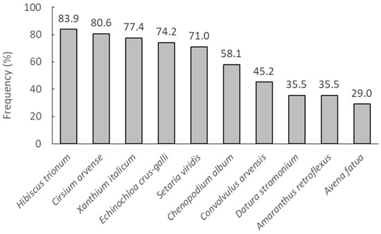 Comparing these results with those of our previous study, which was carried out on pea fields but in the same area as the current one, we can see that there is a high degree of similarity in terms of weed species’ cover and frequency. Most of the top ten weeds with the highest cover in peas and canary grass are identical, and the cover values of Cirsium arvense and Xanthium italicum differ by less than 0.1%. The exceptions are only Chenopodium polyspermum and Tripleurospermum inodorum, which characterized the pea fields, but not the canary grass [75]. This suggests that the species most characteristic of the landscape will be of greater importance irrespective of the type of crop [76].