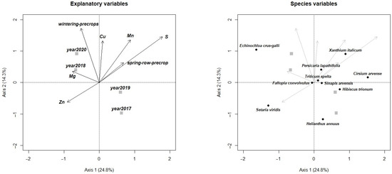 The results of the redundancy analysis showed that the year of the study had the largest effect on the weed flora, which could be explained by the different rainfall conditions, as changes in rainfall were consistent with changes in weed abundance. Other important descriptive factors were the nutrient (S, Cu, Mg, Mn, and Zn) content of the soil and the preceding crops, which also had a clear influence on the composition of the weed vegetation.