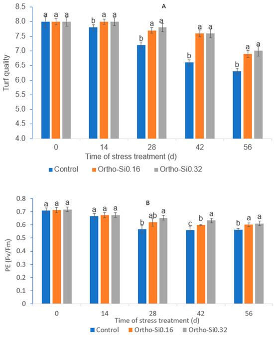 Turf quality (A) and photochemical efficiency PE, (B) content responses to Ortho-Si applications at 0 (control), 0.16 mL m−2 (Ortho-Si0.16) and 0.32 mL m−2 (Ortho-Si0.32) in creeping bentgrass under heat and drought stress conditions. The treatments marked with the same letters (a, b, or c) for each sampling date are not significantly different at p = 0.05.