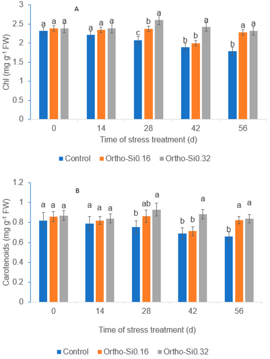 The heat and drought stress reduced carotenoid content in the control plants, and the Si treatment was at a low rate beginning on day 42. Foliar application of the Ortho-Si increased leaf carotenoid content when compared to the control from days 28 through 56, except for the low rate on days 28 and day 42 (Figure 2B). The Si treatments at 0.16 mL m−2 and 0.32 mL m−2 increased carotenoid content by 25.5% and 27.2%, respectively, when compared to the control at the end of the trial. There were no differences in leaf carotenoid content between the two Ortho-Si rates at all sampling dates except for day 42.