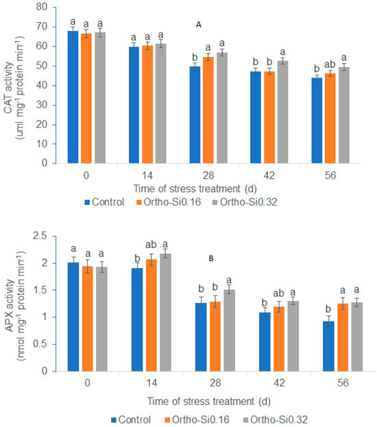 The leaf CAT activity declined in response to the stress treatment beginning on day 14. The Ortho-Si treatments at the high rate consistently increased leaf CAT activity relative to the control as measured from day 28 through day 56 (Figure 5A). The Ortho-Si at the low rate also increased CAT activity relative to the control at day 28 and day 56. On day 56, the Ortho-Si at 0.32 mL m−2 increased CAT activity by 12.8% compared to the control.