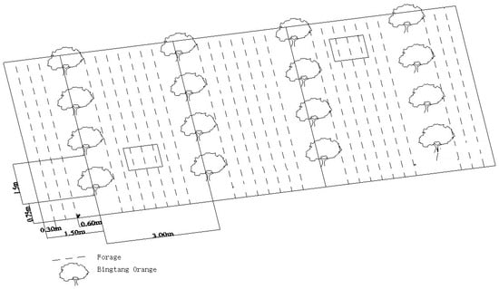 The leguminous forage crops, alfalfa (WL525HQ) and gramineous grass ryegrass (MATHILDE), were selected as symbiotic grass. Three forest–grass intercropping patterns were set up in the experiment, namely, Bingtang orange–alfalfa sowing (B), Bingtang orange–ryegrass × alfalfa mixed sowing (A), and Bingtang orange–ryegrass × alfalfa intercropping (R). Meanwhile, Bingtang orange monocropping was set as the control treatment (CK) (Table 2). Each treatment was performed in four replicates, with a total of 16 plots. Each plot covered 3 m × 3 m and consisted of 6 Bingtang orange trees, and a 1 m buffer interval was set between different plots. In September 2020, the grass was sown in lines in the same direction under the Bingtang orange forest. Before sowing, the soil surface layer (0–20 cm) was ploughed, the soil depth was 4–5 cm, and the row spacing was 30 cm (Figure 2). A 1 m buffer interval was set between different treatments, and each treatment was repeated four times; there were a total of 16 quadrats, each with an area of 3 × 3 m, and six Bingtang orange plants. When the grass height reached 30–40 cm (about 60 days in the dry season and 30 days in the rainy season), the grass was mowed manually. The field management was the same as that in the local Bingtang orange orchard, and timely fertilization, sprinkler irrigation, and pesticide application were carried out according to the growth of Bingtang orange trees and grass, and the amount of fertilization, irrigation, and pesticide application for each treatment was the same. The sprinkling irrigation was used for the irrigation of the plot. In the dry season, when there is little rain or few rain in 15 days, irrigation for about 4–8 h was carried out for all the plots. In February, March, and May, 100 g of urea was applied to each tree, and in April and July, 150 g of urea was applied to each tree. Some pesticides, namely methyl thiophanate, imidacloprid, and Avermectin were applied for the prevention of pests.