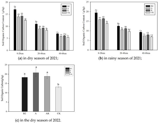 Content of SOC under different forest–grass composite patterns. The different treatments were (B2) Bingtang orange–alfalfa sowing, (A) Bingtang orange–ryegrass × alfalfa mixed sowing, (R) Bingtang orange–ryegrass × alfalfa intercropping and (CK) Bingtang orange monocropping. Columns followed by the different uppercase letters indicate statistically significant differences at p < 0.05 for the different soil layers of the same treatments. Columns followed by the same lowercase letter indicate statistically significant differences at p < 0.05 for the same soil layer of different treatments.