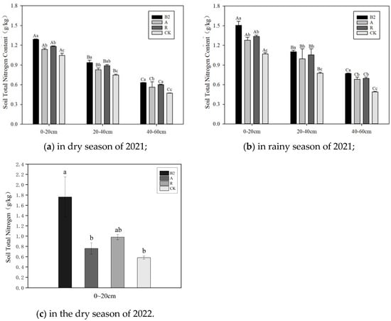 Soil total N under different forest–grass composite patterns. The different treatments were (B2) Bingtang orange–alfalfa sowing, (A) Bingtang orange–ryegrass × alfalfa mixed sowing, (R) Bingtang orange–ryegrass × alfalfa intercropping and (CK) Bingtang orange monocropping. Columns followed by the different uppercase letters indicate statistically significant differences at p < 0.05 for the different soil layers of the same treatments. Columns followed by the same lowercase letter indicate statistically significant differences at p < 0.05 for the same soil layer of different treatments.