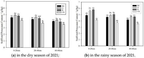 Soil total K in different intercropping treatments was sorted as R > A > B2 > CK (Figure 6). The soil total K in R and A were between 4.5 and 6 g·kg−1, which was significantly higher than that in the CK treatments at about 4 g·kg−1. Compared with CK, the R treatment led to an increase in total K at different depths of 0~20 cm, 20~40 cm, and 40~60 cm, which increased by 16%, 18%, and 22% in the dry season and 40%, 36%, and 32% in the rainy season.