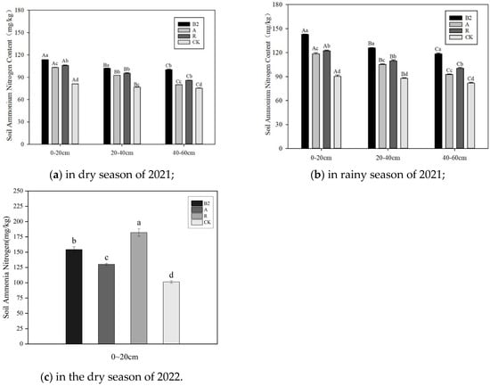 Soil ammonium nitrogen content under different forest–grass composite patterns. The different treatments were (B2) Bingtang orange–alfalfa sowing, (A) Bingtang orange–ryegrass × alfalfa mixed sowing, (R) Bingtang orange–ryegrass × alfalfa intercropping and (CK) Bingtang orange monocropping. Columns followed by the different uppercase letters indicate statistically significant differences at p < 0.05 for the different soil layers of the same treatments. Columns followed by the same lowercase letter indicate statistically significant differences at p < 0.05 for the same soil layer of different treatments.