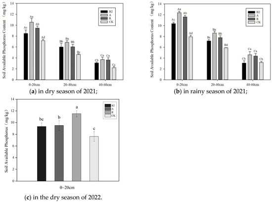 Soil available phosphorus content under different forest–grass composite patterns. The different treatments were (B) Bingtang orange–alfalfa sowing, (A) Bingtang orange–ryegrass × alfalfa mixed sowing, (R) Bingtang orange–ryegrass × alfalfa intercropping and (CK) Bingtang orange monocropping. Columns followed by the different uppercase letters indicate statistically significant differences at p < 0.05 for the different soil layers of the same treatments. Columns followed by the same lowercase letter indicate statistically significant differences at p < 0.05 for the same soil layer of different treatments.