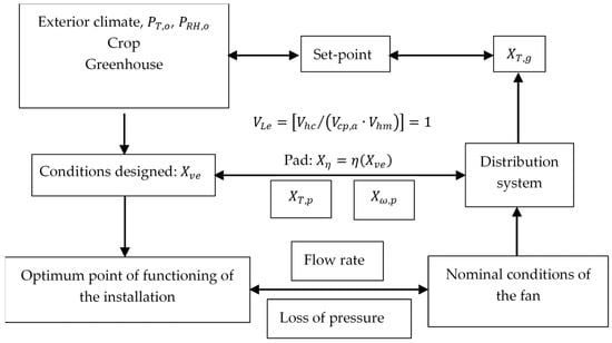 The analysis of the cooling process allows us to obtain a value for the temperature and relative humidity of the air after passing through the fan pad ( and ). The optimal flow rate of the installation is what is necessary to guarantee its correct operation. The optimum point of functioning of the installation was determined, defined by the flow rate and pressure values needed to circulate the air through the fan pad and the distribution system. The nominal flow rate of the fan corresponds to the highest value of its performance. It is necessary to choose a commercial fan with nominal conditions (flow rate and pressure loss corresponding to the maximum value of its performance) that are the most similar to the optimum functioning of the installation. The operational flow rate of the fan is the actual operating value. It must be as close as possible to the values of the optimal flow rate of the installation and the nominal flow rate of the fan. The operational flow rate and pressure of the fan were determined, and the energy provided by the air through this propulsion system was considered in order to estimate the temperature of the air in the distribution system. Next, the temperature and relative humidity inside the greenhouse were obtained and compared with the set-point value to establish the technical viability of the installation (Figure 2). Lastly, the effect of the use of a variable frequency drive on the reduction in the consumption of energy of the air propulsion system was assessed.