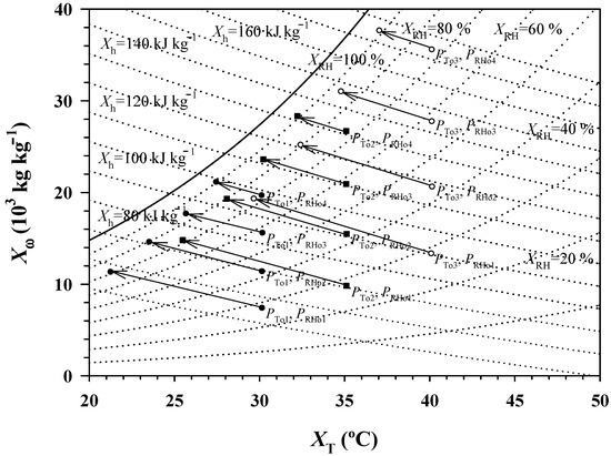Diagram of (°C) as compared to (103 kg kg−1) with the representation of (%) and (kJ kg−1) lines. The oriented segments represent the evaporative cooling processes in the pad for the initial states of the exterior air at different temperatures ( = 30 °C, black circles; = 35 °C, black squares; = 40 °C, white circles) and relative humidity ( = 30%, = 45%, = 60% and = 75%).