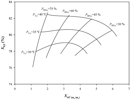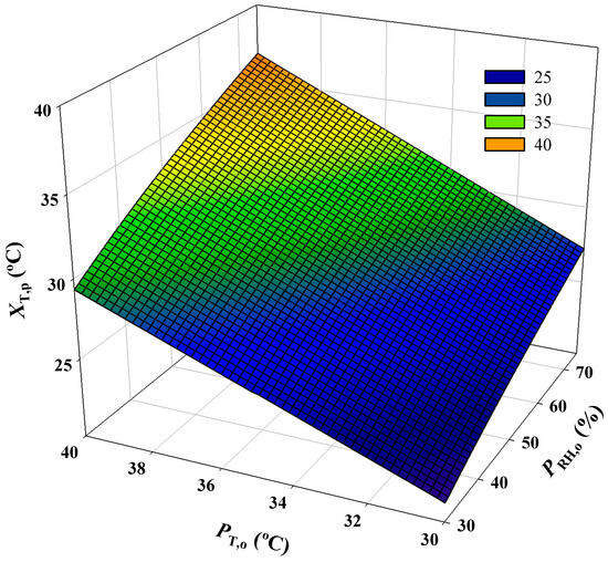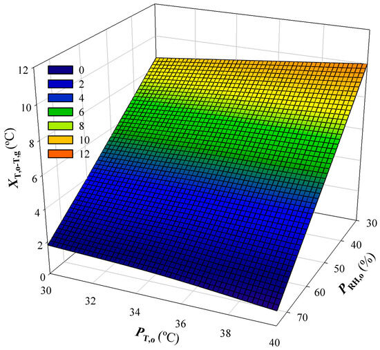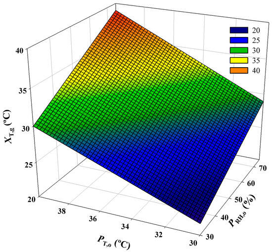Figure 4 represents the value of the air temperature as it exits the pad (, °C) as a function of the initial state of the air to be treated, provided by and . The result is a linear increase in the values as and increase.