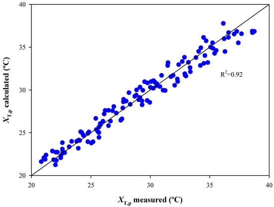 Regression of calculated starting with the balances of mass and energy as compared to the value measured experimentally.
