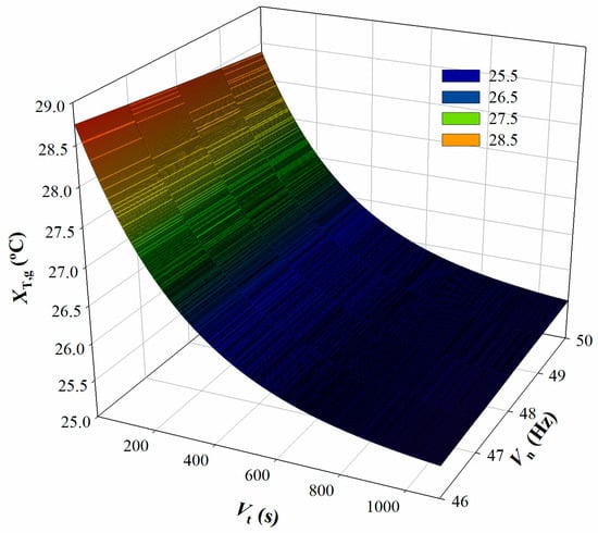 Figure 10 shows the temporal changes in as a function of . The changes in the functioning of the extraction–driving systems due to the variation in the frequency utilized did not actually affect the value. As the value of the frequency decreased, the initial value of the temperature in the interior of the greenhouse tended to increase, although its stationary value tended to be lower.