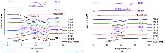 The DSC analysis of IMSs with different ratios of fat materials. PETS, PETO, PEG400MS, and PEG400MO represent the pure components of PETS, PETO, PEG400MS, and PEG400MO, respectively, while samples M1-1 to M2-6 represent different ratios in the IMS. (a): test group of PEG400MS, (b) test group of PEG400MO.
