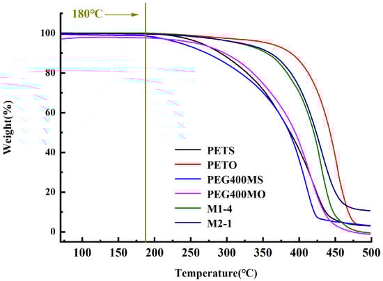 Table 6 presents the softening points and DSC absorption peaks of the oil-phase samples with varying ratios, while Figure 3 and Figure 4 illustrate the thermal behavior of the oil-phase samples during the DSC and TGA analyses, respectively. It can be observed that the softening point gradually decreased with the increase in the amount of PEG400MS added, and the DSC absorption peaks also progressively shifted towards lower temperatures due to the increased quantity of PEG400MS with a low melting point (Figure 3a). The effect of adding PEG400MO was consistent with that of PEG400MS (Figure 3b). The melting point of PETS was observed to be 51.42 °C. With the addition of PEG400, there was a clear downward trend in the melting point. The DSC plots of the sample groups M1-1~M1-6 all exhibited two heat absorption peaks, which could be attributed to the shock-cooling treatment (direct transfer from 60 °C to 0 °C ice/water bath) that the samples underwent. During this process, the low melting point of unsaturated PEG400MS inhibits the crystallization behavior of PETS, potentially leading to the formation of partially crystallized amorphous solids with a lower softening point []. Consequently, formulations M1-4 and M2-1 were initially chosen for the composition of the IMS. The TGA results, as shown in Figure 4, indicate that the components, including PETS, PETO, PEG400MS, and PEG400MO, as well as formulations M1-4 and M2-1, were thermally stable within the temperature range corresponding to the DSC results.