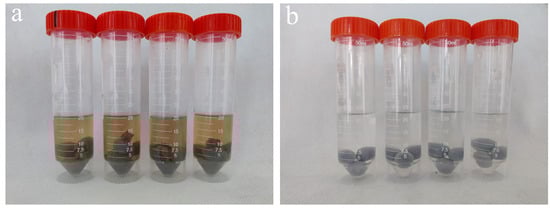 The appearance of beads M1-4 (a) and M2-1 (b) after soaking in water.