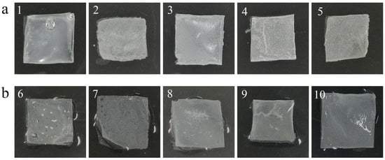 Figure 8 displays the morphologies of the EC/HPMC shells with various ratios before water soaking (a) and after water soaking (b) at 35 °C for 30 days. In this figure, numbers 1–5 correspond to EH1–EH5, respectively, while numbers 6–10 correspond to EH1–EH5, respectively, after water soaking. After 30 days, samples with a higher content of EC were observed to curl, have a rough texture, be harder to the touch, and be prone to breaking when squeezed (pre-soaking samples: 4, 5; post-soaking samples: 9, 10), especially samples 4 and 5, which had not been soaked in water. Conversely, samples with a lower percentage of EC were smoother and tougher in texture and less likely to fold (pre-soaking samples: 1, 2, 3; post-soaking samples: 6, 7, 8). However, too little EC resulted in a thin shell texture and a lack of springiness. An EC-to-HPMC ratio of 5:1 (m/m) was found to be appropriate.