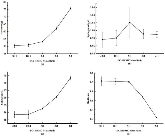 The effect of the amount of HPMC added on the hardness, resilience, springiness, and cohesiveness of the EC/HPMC OTS. (a–d) represent the differences in hardness, springiness, cohesiveness, and resilience of different OTS formulations, respectively (The points in the graph are the mean values; error bars represent standard deviations).