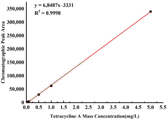 A certain mass of the Tetramycin A standard was accurately weighed to prepare a Tetramycin A stock solution at a concentration of 5 mg/L. Then, a series of standard solutions at concentrations of 0.05, 0.1, 0.5, 1, and 5 mg/L were prepared by diluting the Tetramycin A stock solution with the running phase of HPLC. The running phase for the detection of Tetramycin A in HPLC was a methanol/aqueous formic acid solution with a mass fraction of 1% = 15:85 (v/v). The flow rate was 0.4 mL/min, the UV detection wavelength was 292 nm, and the column temperature was 35 °C. The areas of the absorbance peaks were taken as the vertical coordinates and the mass concentration of Tetramycin A as the horizontal coordinate to produce the standard curve [].