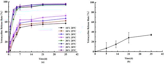 Accurately weighed dry soil samples of 100 g (from experimental field located at 27.009° N, 109.204° E in Guizhou, China) were each added to a ziplock bag. The soil bags were divided into two categories, i.e., those with 10% and 30% water content, by adding certain amounts of tap water. The Tetramycin-loaded beads were buried in the bagged soil and placed in a constant-temperature incubator at 20 °C, 25 °C, 30 °C, and 35 °C. The beads were taken out for testing on days 1, 3, 5, 7, 14, 21, and 35, with each test repeated three times. The mean value from the three replicates was taken to plot the release curve. The initial Tetramycin content in the beads, recorded on day 0, served as the input for the following calculations: