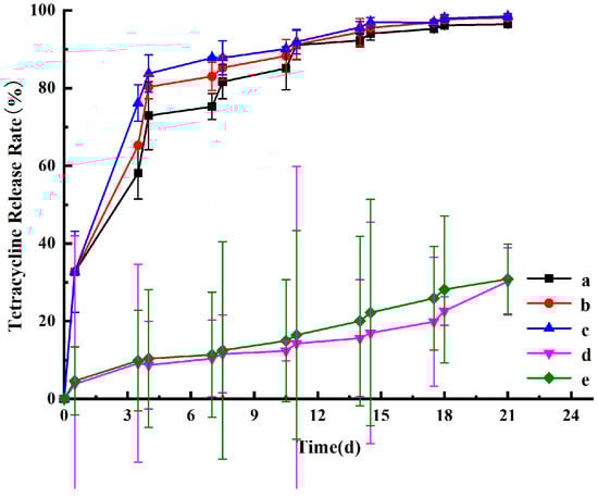 The simulation of field soil conditions to test the release properties of the Tetramycin-loaded beads. (a) The simulated field soil conditions involved cycling between hot/wet soil (35 °C, 30%) for 12 h and cold/dry soil (20 °C, 10%) for 3 days. (b) The simulated field soil conditions involved cycling between hot/wet soil (35 °C, 30%) for 12 h and hot/dry soil (35 °C, 10%) for 3 days. (c) The simulated field soil conditions involved cycling between hot/wet soil (35 °C, 30%) for 12 h and cold/wet soil (20 °C, 35%) for 3 days. (d) The Tetramycin-loaded beads were placed in air at 20 °C. (e) The Tetramycin-loaded beads were placed in air at 35 °C.