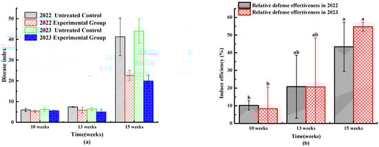 The preventive effect of the Tetramycin-loaded beads on the bacterial wilt of tobacco was evaluated at the field level, located at 27.009° N, 109.204° E, with an altitude of 850 m, over two years, namely, 2022 and 2023. The experimental plots were heavily diseased areas with severe bacterial wilt from the previous years, and they did not require additional inoculation with Ralstonia solanacearum to result in disease; the subsequent results also confirmed this. Tobacco seedlings of Yunyan85 without agricultural antibiotic application served as the untreated controls, while tobacco seedlings with Tetramycin-loaded bead application constituted the experimental group. In the field ridge, a vertical pit approximately 25 cm deep was dug, and three beads (theoretical applied amount of Tetramycin: 1.152 g) were placed at the bottom of the pit; they were covered with soil, and then the tobacco seedlings were placed on top. There was a total of 2 treatments, each with 3 replicates and 60 tobacco seedlings per replicate, resulting in a total of 180 tobacco plants per treatment. The disease incidence of the tobacco plants in all treatments was assessed at 10, 13, and 15 weeks after the application of the Tetramycin-loaded beads in each group. The disease index statistics were calculated according to the National Standard of the People’s Republic of China (Grade and Investigation Method of Tobacco Diseases and Insect Pests-GB/T 23222-2008) on bacterial wilt disease severity classification (see Appendix A for details) [], and both the disease index and relative efficacy were calculated.