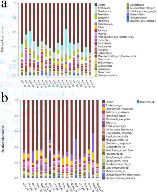 The principal coordinate analysis (PCoA) plot for the analysis of differences in the microbial community structure among various bacterial (a) and fungal (b) samples. CK represents the untreated control; Tmn represents the group with Tetramycin pellets; 1, 2, and 3 refer to plants analyzed 10, 13, and 15 weeks after transplantation, respectively; and 10, 20, and 30 refer to the depth of the surface in the soil samples.
