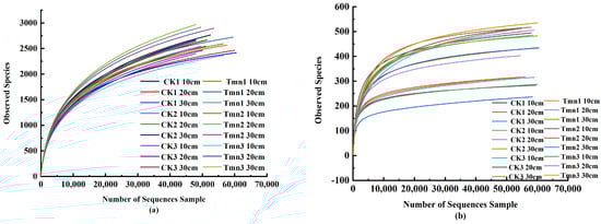 Using mothur v.1.31.2 [] software, alpha diversity indices, including Chao1, Ace, Simpson, and Shannon, were calculated for bacterial and fungal communities within the soil samples. Using the known relative proportions of various OTUs in the sequenced data, we calculated the expected values for each alpha diversity index. This was carried out by extracting a subset of n tags (where n is less than the total number of sequenced reads) and plotting those values against their corresponding alpha indices. The subsets of n were selected from a geometric series smaller than the total number of sequences, with a minimum increment of 500 tags for this project. The dilution curve was then plotted using Origin 8.5 software (OriginLab Co., Northampton, MA, USA). For genus complexity analysis, a distance matrix generated by QIIME v1.80 [] software was employed to assess beta diversity between the samples. Subsequently, principal coordinate analysis (PCoA) was performed using R v4.0.5 software using the “ggplot2” package with the Bray–Curtis distance.