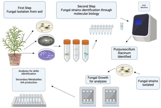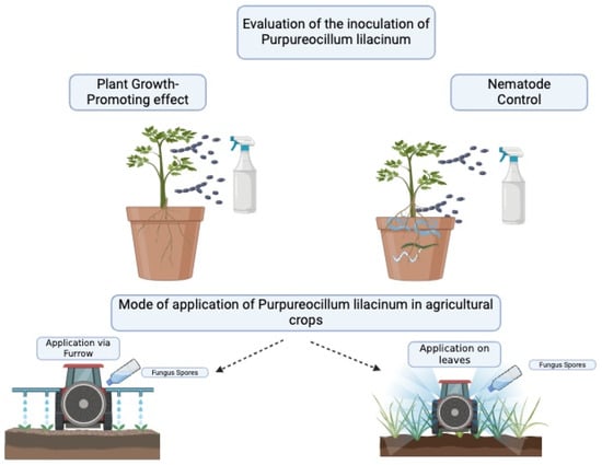 The fungus Penicillium digitatum is a major cause of green mold in oranges, leading to significant economic losses during storage, transport, and marketing, accounting for up to 90% of the orange losses in some regions. P. lilacinum produces a secondary metabolite that, when applied in oranges, can completely stop the growth of the harmful fungus P. digitatum by breaking down its cell walls and preventing its spores from growing. Interestingly, the use of P. lilacinum reduced the use of fungicides to avoid the presence of mold [69]. Figure 1 shows different steps regarding the isolation, identification, and characterization of the fungus P. lilacinum from the soil. Figure 2 shows the mode of application of this fungus in crop production.